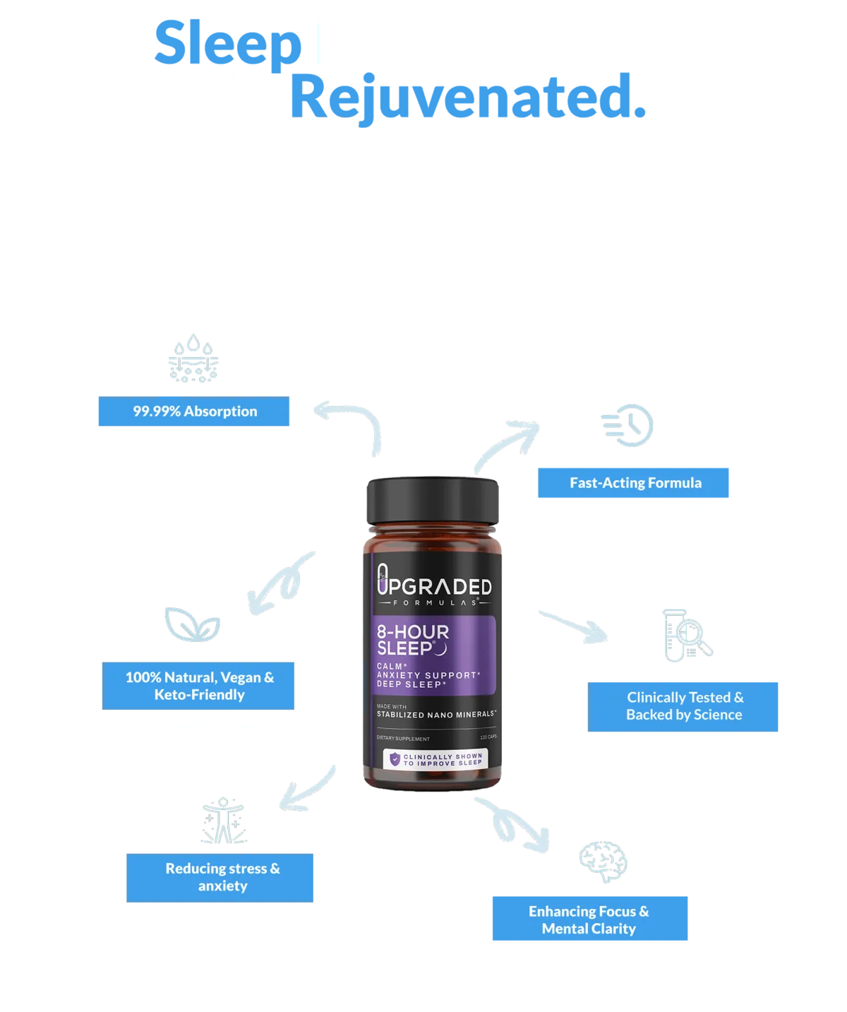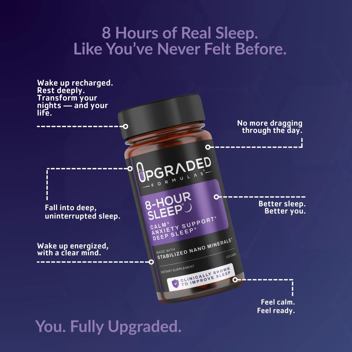 Millions struggle with poor sleep, but we have the solution. Upgraded Formulas 8-Hour Sleep Supplement is designed to help you fall asleep faster, stay asleep longer, and wake up feeling truly refreshed.