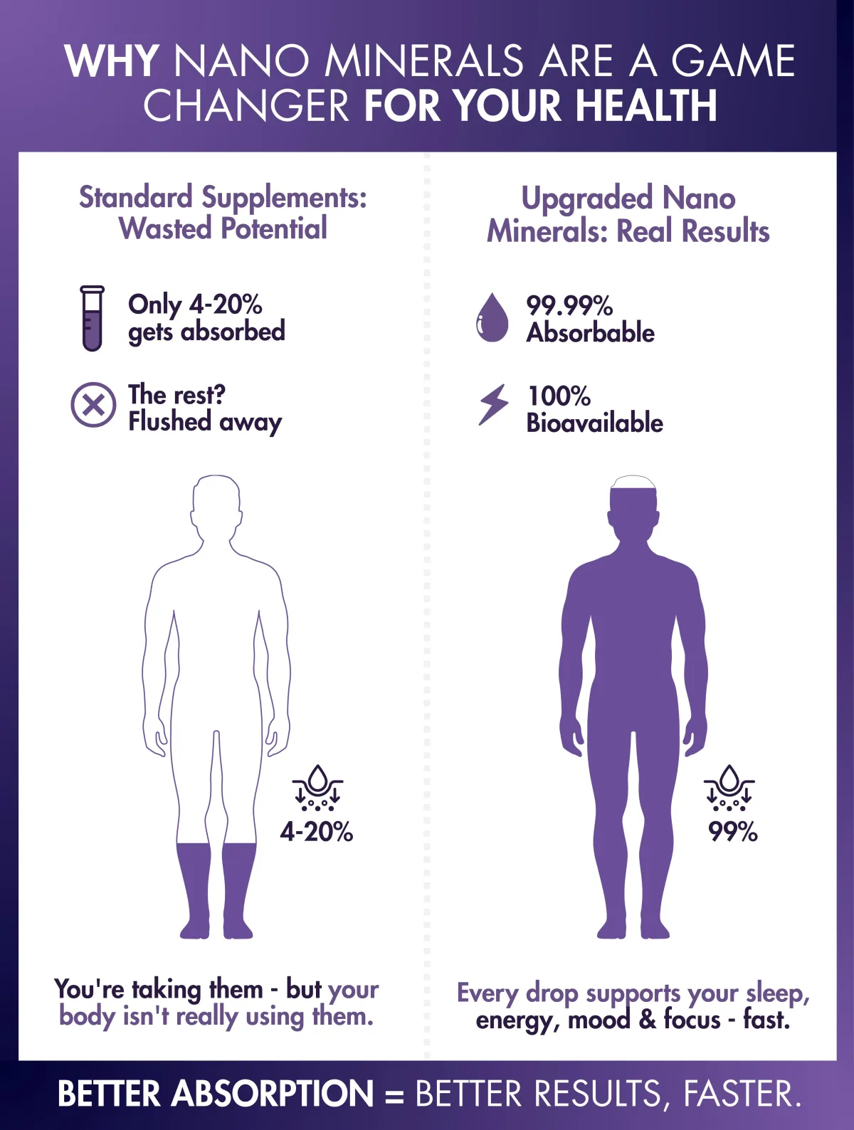 That’s why I developed Nano Particle Technology, a breakthrough in mineral absorption that ensures 99.99% bioavailability, delivering fast and effective results for better sleep, sharper focus, and sustained energy.